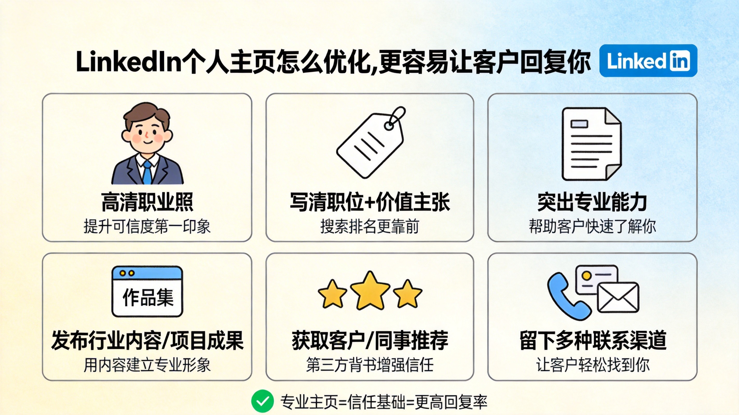 所以 LinkedIn 获客里,主页不是装饰,而是你一切触达动作之前的信任底座。